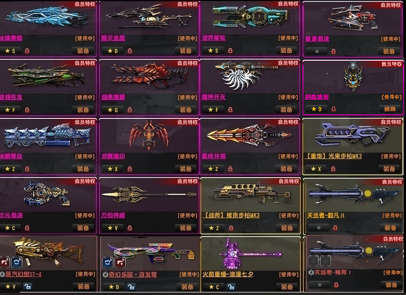 皇家紫钻,蛇神冰璃寒蟒,万钧神威,次元裁决,特典狙黯影,四件套,狼契,圣翼。3-22赛季悬赏,