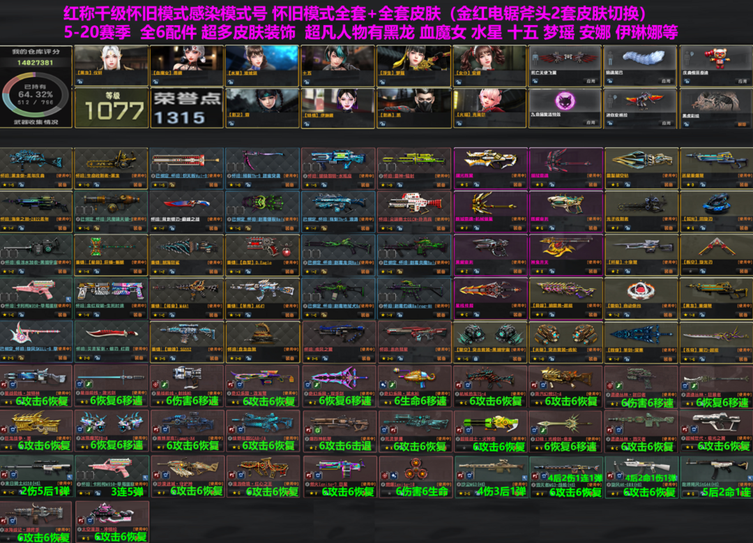 限制: 撤单率<30%才可租用此帐号装备描述:电信一区,红称千级感染号,怀旧模式全套(黑龙炮、斧头、皮肤金红等全套皮肤、圣诞毁灭者4后2伤2连)。辉耀审判、神鬼开天、暗雷兽、歼星、弧光、擎空、天驱、圣剑等,,5-20季全套。千万积分打造全部双66配件,所有枪全部上双66配件。超多皮肤枪和僵尸皮肤装饰等,超凡人物血魔女、水星、特情伊琳娜、影杀。 A佬出租欢迎你的光临!喜欢请收藏店铺,店铺里下单可领红包。 【已去黑雾,画面优化,画质清晰。【欢迎收藏】