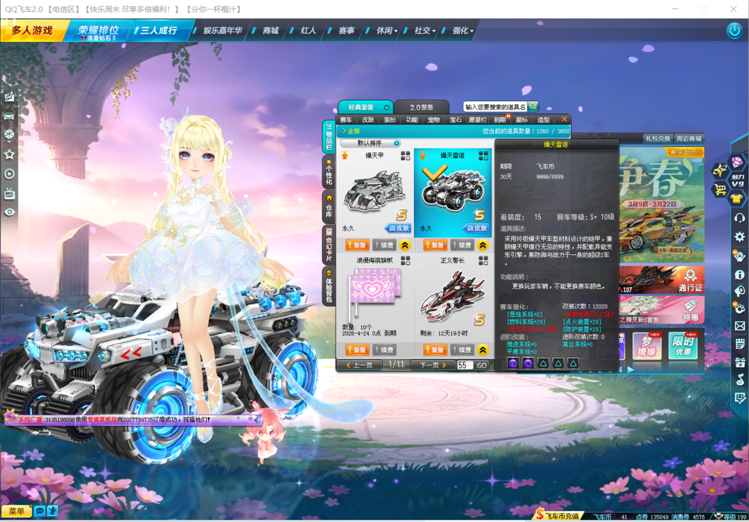 装备描述:爆天雷诺(5项29双四)终极众神-霹雳和弦(5项29双四),爆天甲-奥丁(5项29双四),雷诺-幻夜5阶(6项29进阶40双四),缤纷神驹(5项29进阶20三颗四级),雷霆机甲(5项20,三颗三级)140多页女装,竞速宠物爱丽莎强化+10。