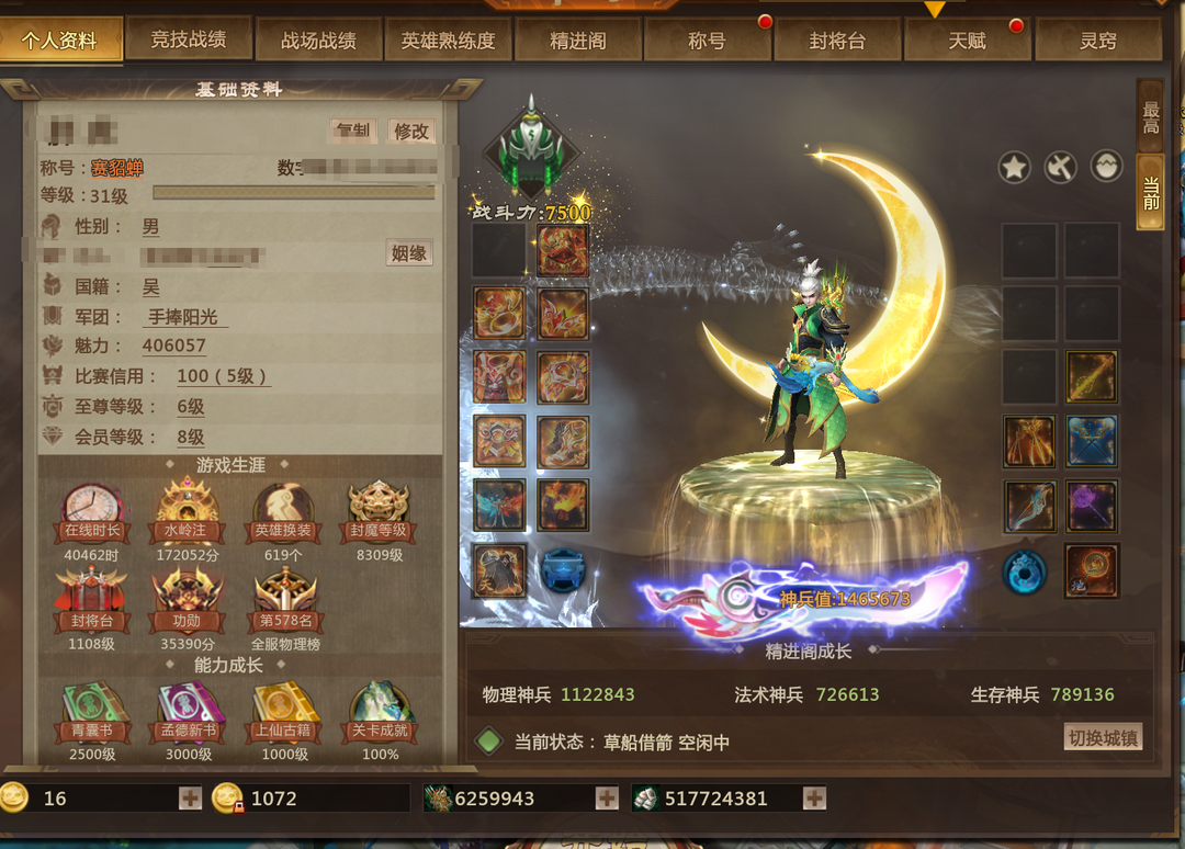 装备描述:草船区极品玩具 至尊6(903星标)5年少 619皮肤 146W神兵 5灵尊 站街1361破甲574爆伤 宠物狐狸 鲲鹏 龙王 龙子 鬼帅 玩具有 幻神 阴阳剑 最佳情人 庸神剑 朱雀裂开爪 天魔巨锤 狮子 幸运鹅 火马 大声翅膀 九尾 熊猫转转 31级自定义称号 缺年少张角 其余全有 31级彩色称号