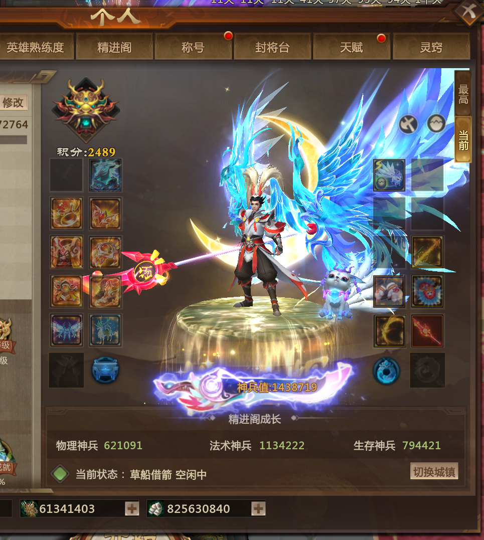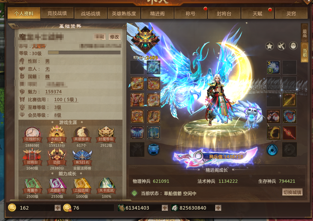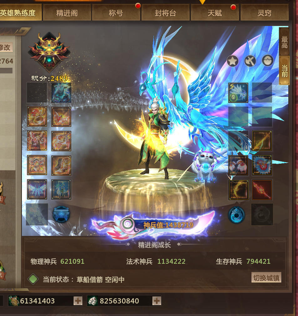装备描述:6年少锦鲤 鹿鸣风啸 617皮肤 143W神兵 5灵尊 站街1063爆伤 宠物狐狸 龙子 鬼帅 鲲鹏 狐狸 玩具 金星灵 星灵 双蓝灯管 圣诞 幻神 最佳情人 冰雪叹息 九尾 熊猫转转 鬼帝 鹿鸣 风啸 萌萌哒 金甲套 富商套 超多小玩具 周年拉满 2000天会员 全年少 详细看图