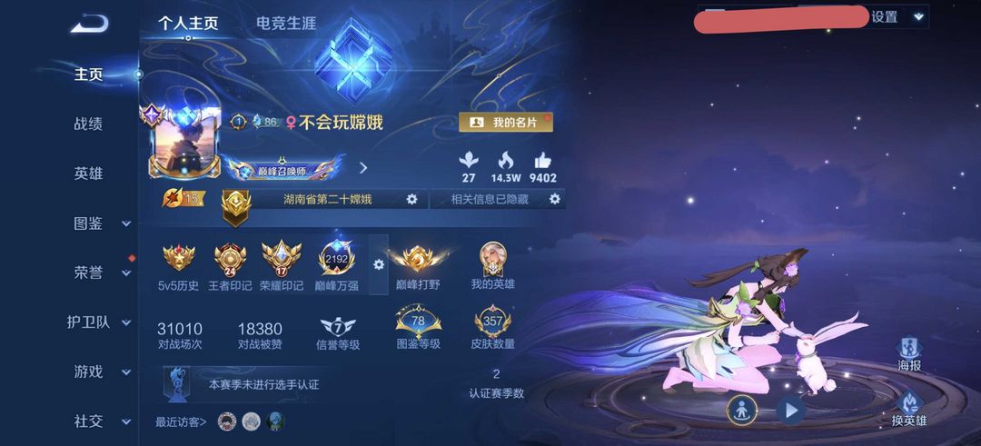 限制: 租号10次及以上 | 撤单率<29%才可租用此帐号装备描述:传承皮肤需要手动开启,在贵族里面,一个月可用8天,734个皮全传说全无双 应异地问题,4小时起租,撤单说明原因,随意撤单拉黑,多组多送 ♥可上正常号 勿骂人挂机,不然拉黑,扣分太多会加押金10元,分数恢复会去掉押金 ♥可排禁巅峰♥尽量不要用嫦娥排位掉胜率影响美观,玩的厉害也可以玩 排名框和巅峰分以标题为主 每周更新 此账号可排位禁巅峰。 ♥如发现辱骂,代打,违规消息被禁言扣除租金押金,恶意修改带练系方式昵称或非主流昵称永久拉黑