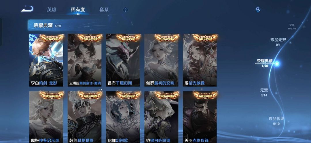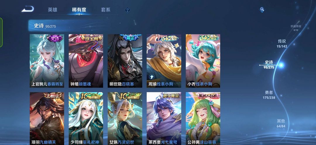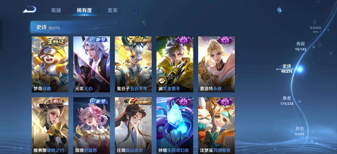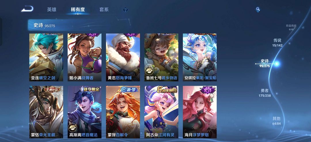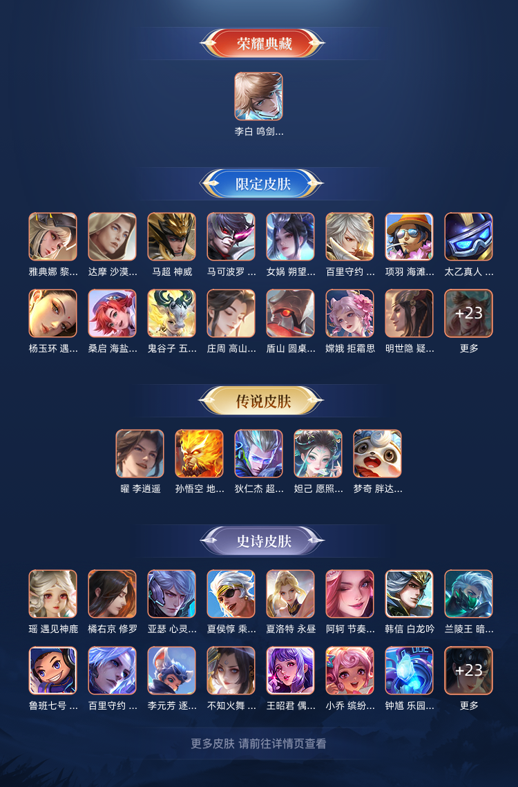 装备描述:鸣剑曳影,幽冥火狄仁杰星传说,画中仙久胜战神,胖达荣荣,神威修罗朱雀志魅语,每个英雄都有皮肤350皮,不多但也不算少