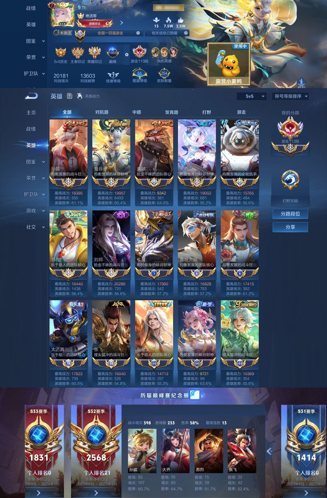 在榜全国百强游走114段历史国服游走❤8历史国服大乔鬼谷子2W战力百段游走❤小兵露营小黄鸭