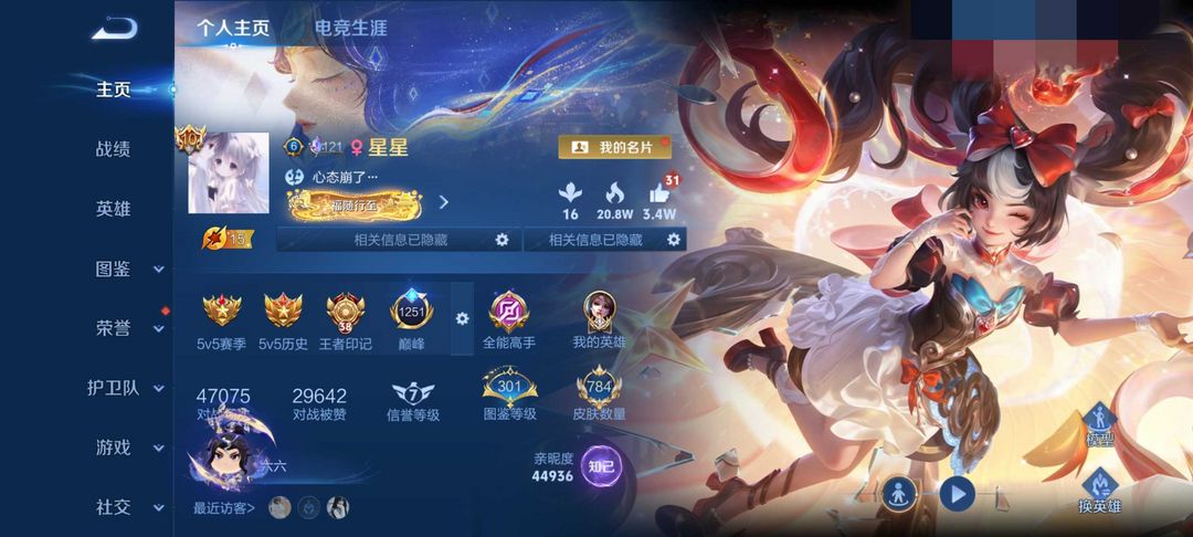荣耀v10不禁言❤784皮满皮肤满按键满水晶满星元满小兵❤历史国服貂蝉1.9万❤安琪拉-颠倒童话