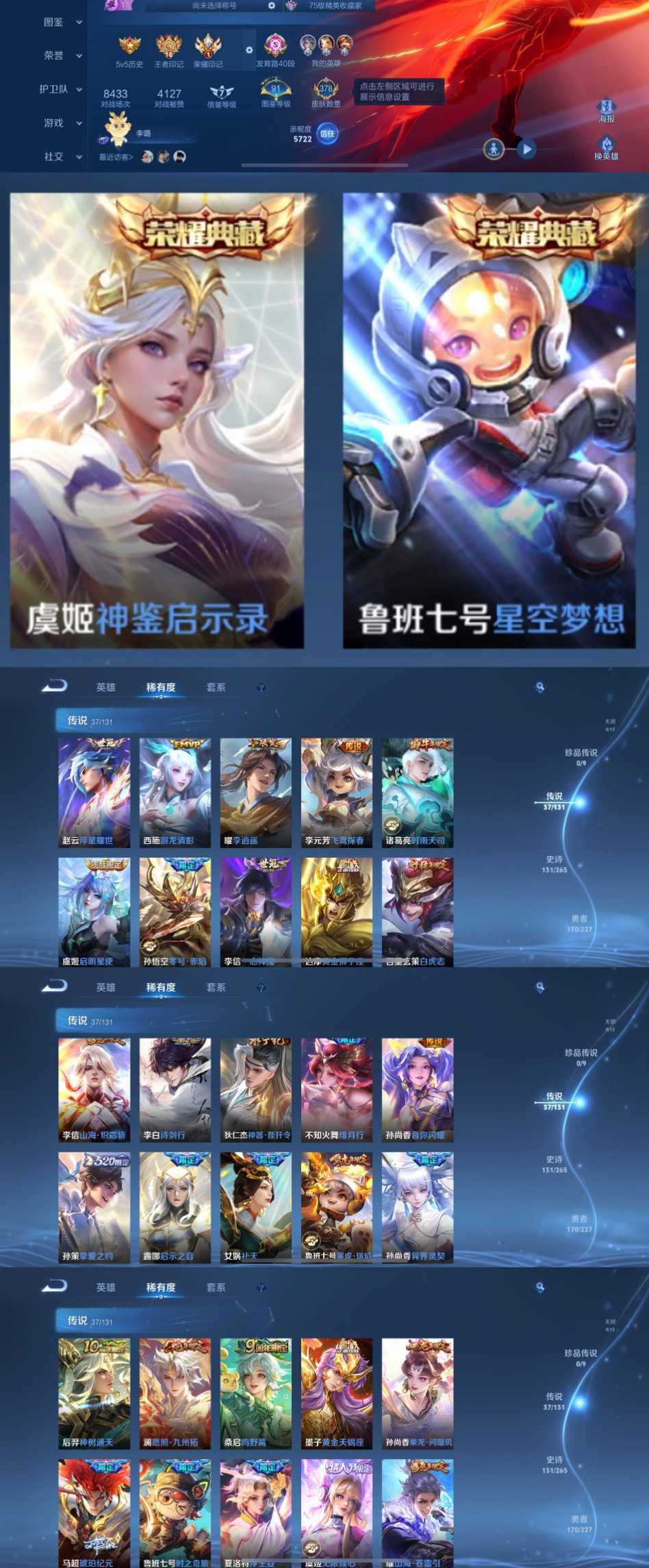 限制: 租号1次及以上 | 撤单率<49%才可租用此帐号装备描述:时间到了还登录白玩或者顶号全部改密拉黑处理永不解除,顶号机器会秒禁玩改密,顶号不仅拉黑还没得玩,赚三两块不容易,请理解谢谢。 ❤❤❤❤❤❤❤❤❤❤❤❤ 请勿开挂,挂机,送头,骂人,撤单后游戏等如有违规永久拉黑永不解除。 重置二级密码不要费劲了,号主每天都会上号查看,多行不义必自毙,人在做天在看,多做好事多自律,少做缺德事 该号英雄127个皮肤378个,典藏2个,星传说4个,传说37个,史诗131个,祝你游戏愉快~