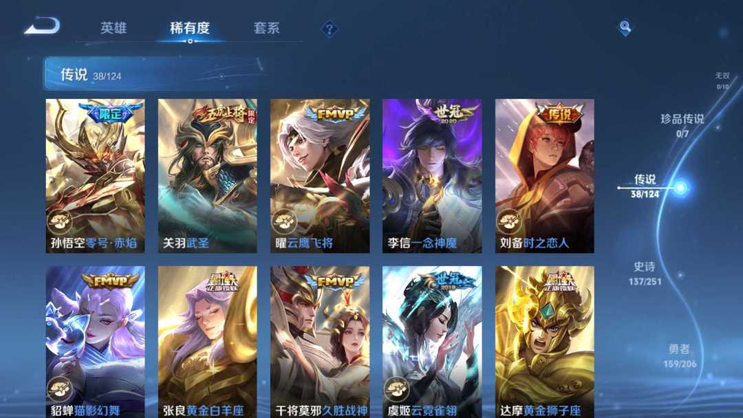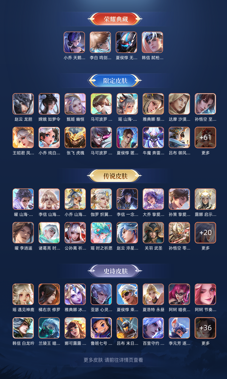 装备描述:孙悟空(孙悟空 齐天大圣,孙悟空 孙行者,孙悟空 零号·赤焰,孙悟空 至尊宝,孙悟空 大圣娶亲,孙悟空 西部大镖客,区标);韩信(韩信 弑枪猎影,韩信 教廷特使,韩信 傲雪梅枪,韩信 街头霸王,韩信 飞衡,韩信 白龙吟,区标);孙尚香(孙尚香 沉稳之力,孙尚香 异界灵契,孙尚香 蔷薇恋人,孙尚香 时之恋人,孙尚香 末日机甲,孙尚香 水果甜心,区标);干将莫邪(干将莫邪 雾都夜雨,干将莫邪 画中仙,干将莫邪 第七人偶,干将莫邪 冰霜恋舞曲,干将莫邪 久胜战神,区标);诸葛亮(诸葛亮 黄金分割率,诸葛亮 掌控之力,诸葛亮 时雨天司,诸葛亮 武陵仙君,诸葛亮 星航指挥官,区标);吕布(吕布 逐霄战戟,吕布 怒海麟威,吕布 末日机甲,吕布 御风骁将,吕布 天魔缭乱,吕布 野性能量,吕布 圣诞狂欢,吕布 猎兽之王);曜(曜 山海·苍雷引,曜 归虚梦演,曜 云鹰飞将,曜 李逍遥 );孙策(孙策 乘龙·淬吴钩,孙策 挚爱之约,孙策 末日机甲,孙策 海之征途,孙策 猫狗日记);马可波罗(马可波罗 山海·玄木吟,马可波罗 暗影游猎,马可波罗 激情绿茵);小乔(小乔 纯白花嫁,小乔 山海·琳琅生,小乔 音