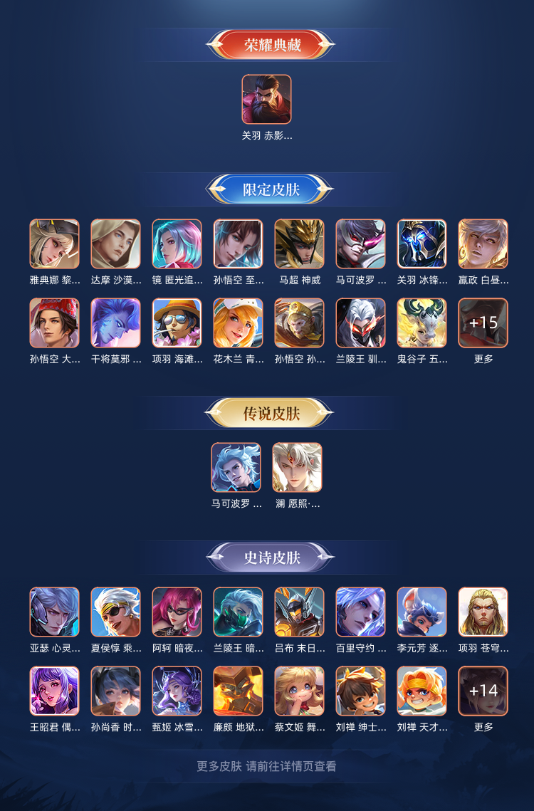 装备描述:【传说皮肤6】 花木兰冠军飞将 澜愿照九州拓 桑启鸣野蒿 马可波罗深海之息 马超无双飞将 镜炽阳神光 【年限皮肤1】 澜愿照九州拓 【珍宝阁皮肤2】 姬小满妄想食味 嬴政优雅恋人 【限定史诗34】 孙悟空至尊宝 西施织梦人 蒙恬荣光圣徽 孙膑茶境仙 牛魔星界战将 姬小满妄想食味 亚连破空之剑 蒙犽顽岩魄 雅典娜黎明之约 周瑜雪夜绮愿 司空震地狱燃心 百里玄策原初追逐者 元歌无心 鬼谷子五谷丰年 韩信傲雪梅枪 甄姬女儿国国王 花木兰青春决赛季 镜匿光追影者 孙悟空孙行者 嬴政优雅恋人 关羽冰锋战神 狄仁杰魔术师 干将莫邪冰霜恋舞曲 云中君纤云弄巧 裴擒虎李小龙 马可波罗暗影游猎 马超神威 赵云皇家上将 李元芳银河之约 兰陵王驯魔猎人 蔡文姬繁星吟游 上官婉儿梁祝 嬴政白昼王子 孙悟空大圣娶亲