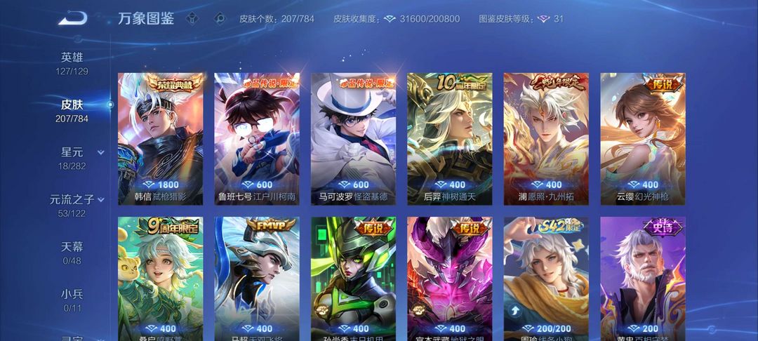 韩信荣耀水晶,柯南 怪盗基德,孙尚香星传说,宫本星传说,英雄127皮肤207