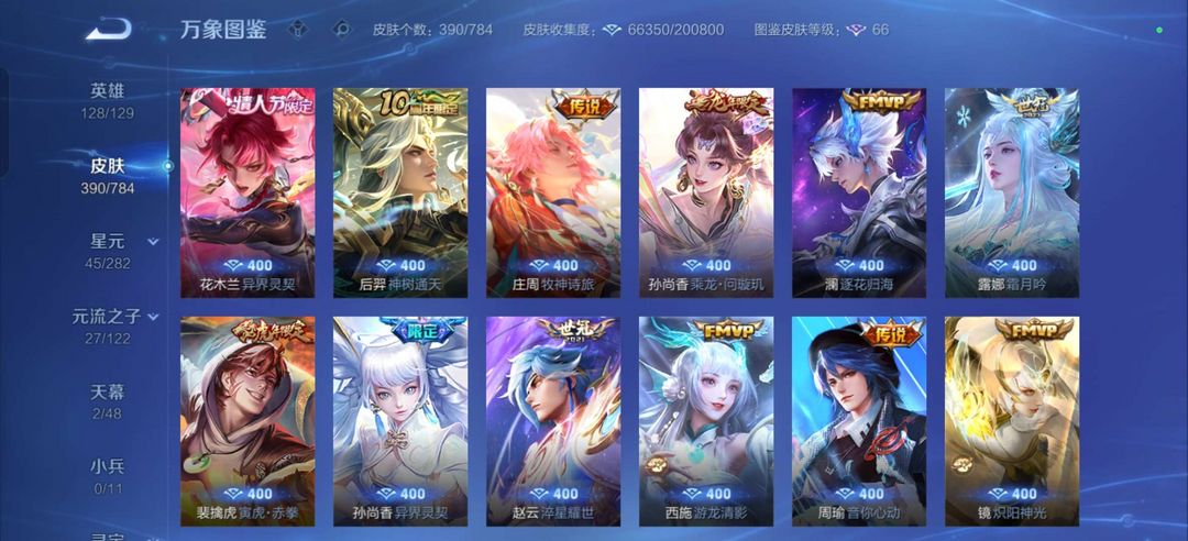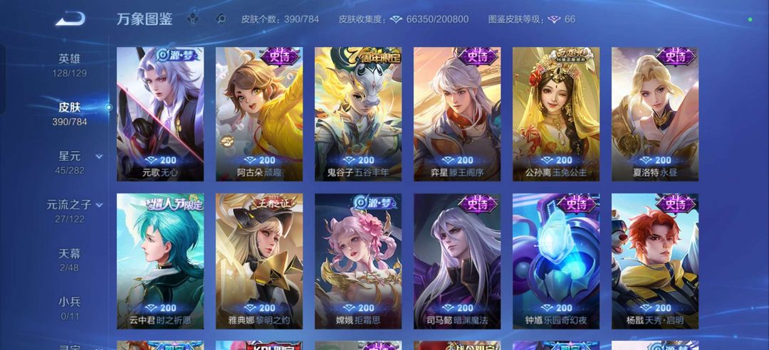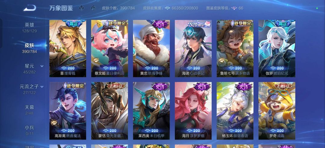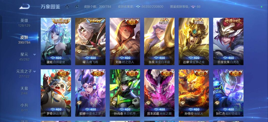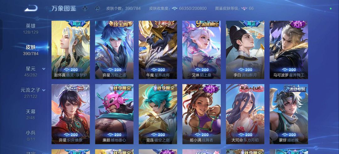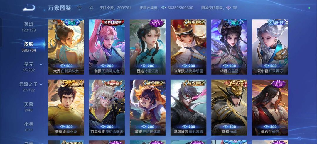 装备描述:四典藏/李信 公孙离无双皮肤/历史金标狄仁杰虞姬 热门射手大热皮肤/热门打野大热皮肤 马可鲁班柯南皮肤