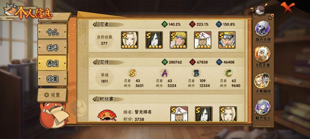 43S♐63A♐2100W战力♐神驹斑♐全高招a忍♐绝大多高招s♐舍人♐侠照侠纲♐须佐卡♐十级霸体♐