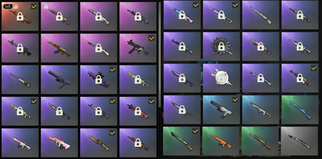 满500级✅马丁跑车✅5级朱雀M4✅彩塘AUG✅新年M762✅小兔航空武器套✅麻烦套装✅朱莉防尘套装