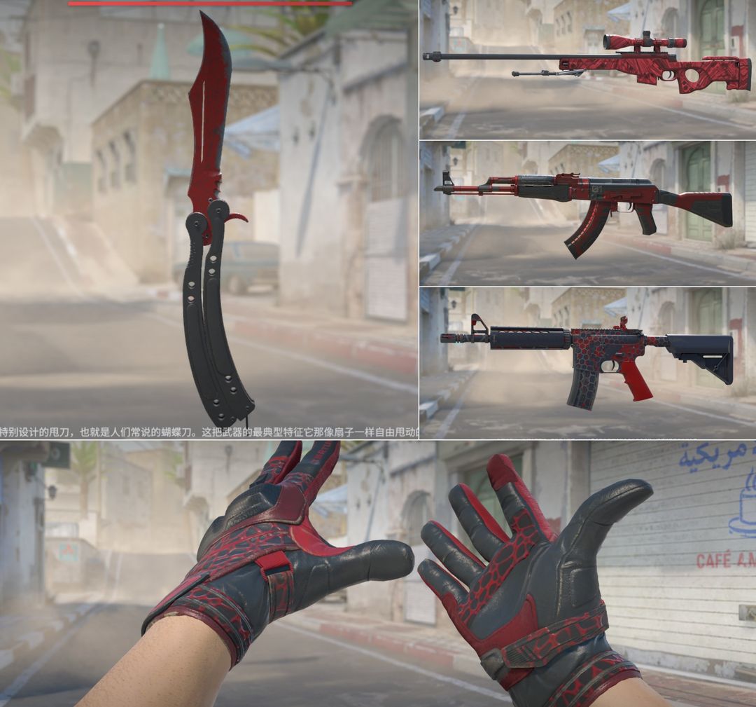 完美B+丨蝴蝶刀深红之网丨血压手套丨AWP热释放丨AK47轨道丨M4A4变频器丨满配红色套