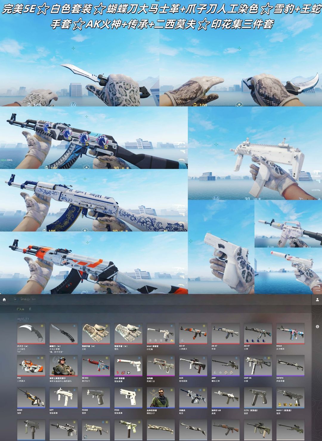完美5E⭐白色套装⭐蝴蝶刀大马士革+爪子刀人工染色⭐雪豹+王蛇手套⭐AK火神+传承+二西莫夫⭐印花集