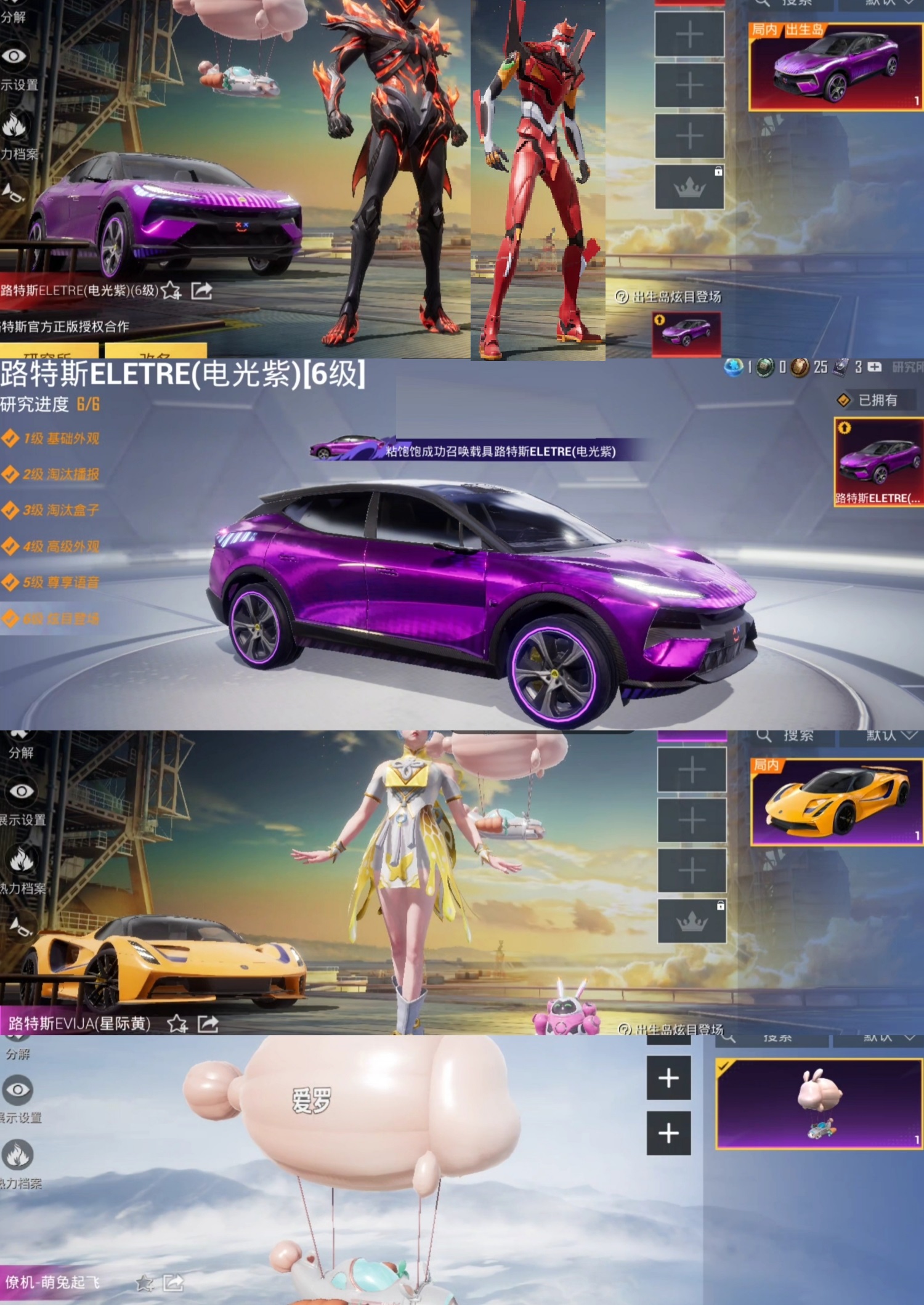 装备描述:满级紫路特斯吉普❤红螳螂二号机❤富婆号❤6级炫目登场❤25粉装❤6特效❤双路特斯