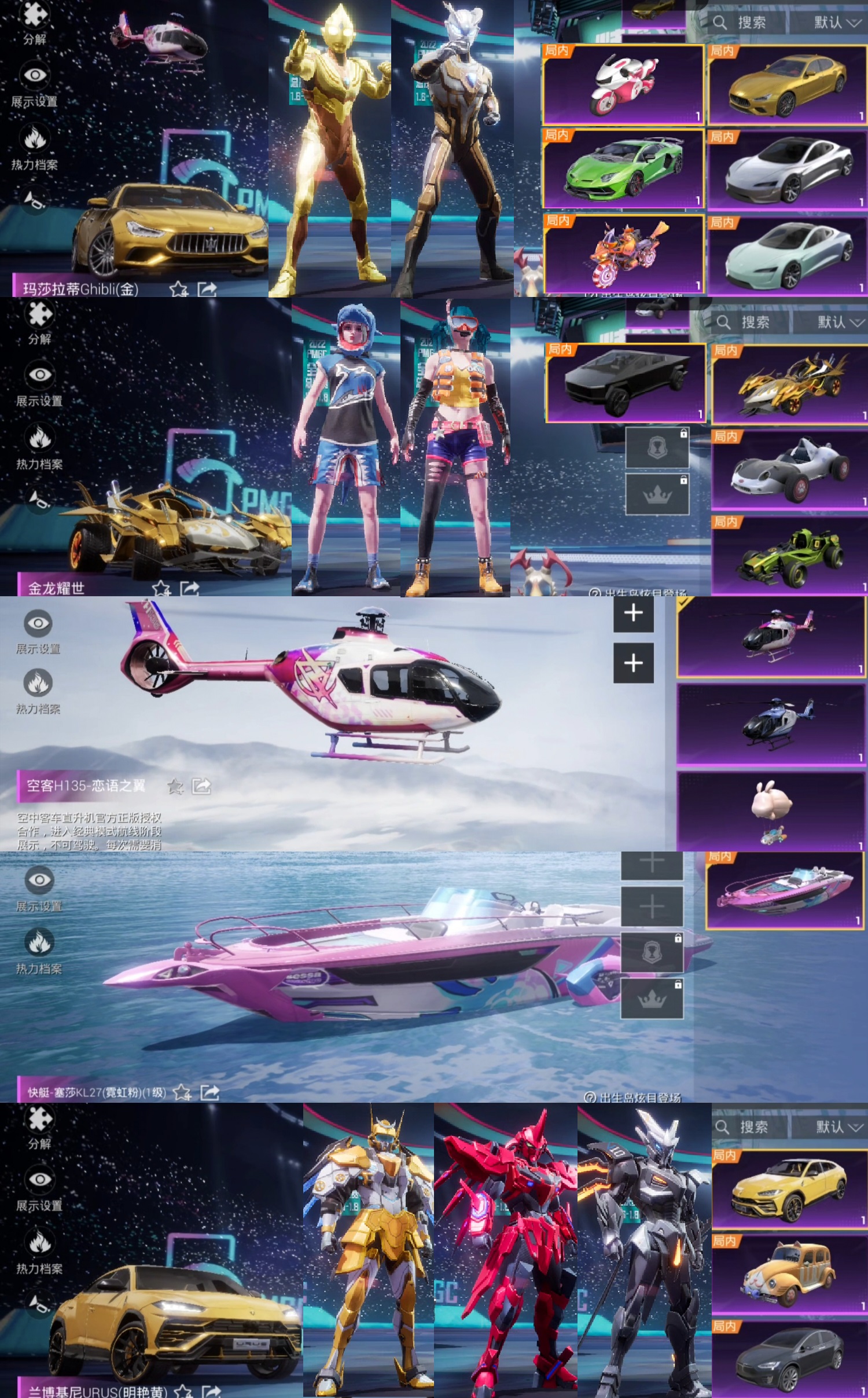 装备描述:17载具❤52粉20特效❤金玛莎拉蒂❤粉空客❤金龙耀世❤铂特斯拉❤兰博基尼萌兔起飞❤金赛罗金迪迦