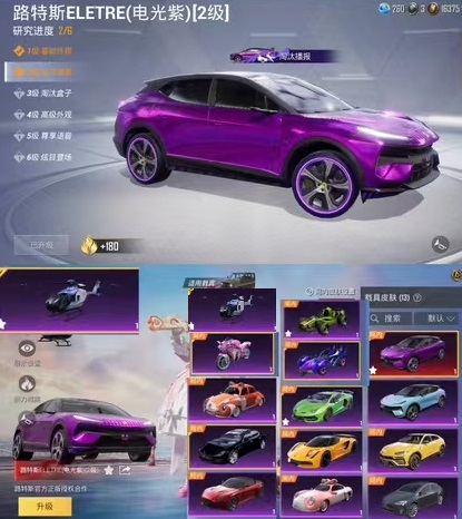 装备描述:14载具❤淘汰播报炫光紫路特斯❤新夜幕蓝玛莎拉蒂❤兰博基尼❤路特斯梦幻火箭10粉