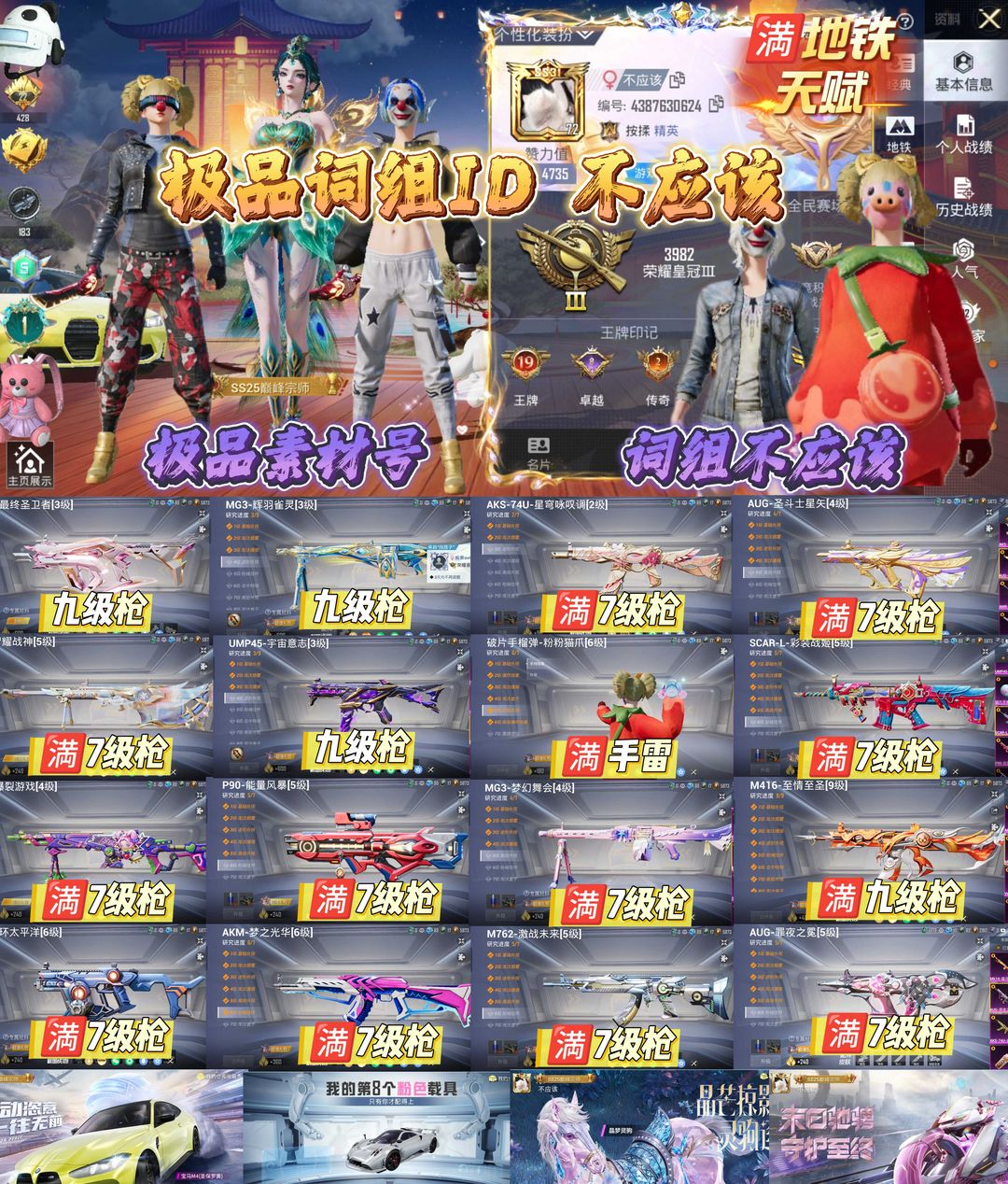 限制: 租号11次及以上 | 撤单率<70%才可租用此帐号装备描述:各位租号的小伙伴们好呀 在游戏里面号主不会找你们哦,小心给骗。 这是我一点点攒出来的心血号,每把升级枪、每个皮肤都藏着我好多好多的热爱。 求求大家租号时手下留情: 不要分解任何枪械/道具,不要随意丢弃物品 不要恶意毁号、乱改设置 不要开外挂、不要在游戏里骂人、不要恶意挂机 账号是我自己辛苦养起来的,一旦被封/被毁,真的会特别特别难过… 如果您玩得开心,也麻烦多多爱惜它,感激不尽 祝您每局都吃鸡,天天都有好心情