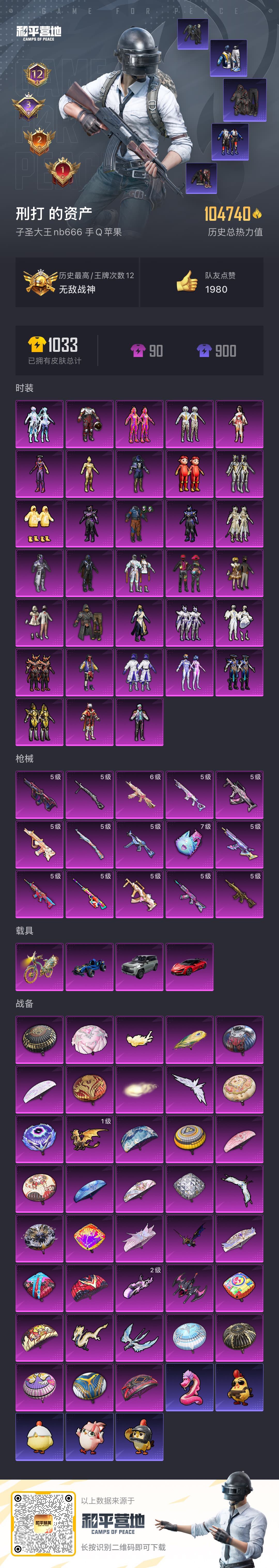 装备描述:极品家园男神号,ss34赛季战神,新补冷酷挑战者,千年幻境,霓虹漫游,15把特效枪,30粉装,满级双人飞行器,4载具,星星裤,热门脏辨,星之信仰,满级特效手雷等各种热门头发传奇收藏家