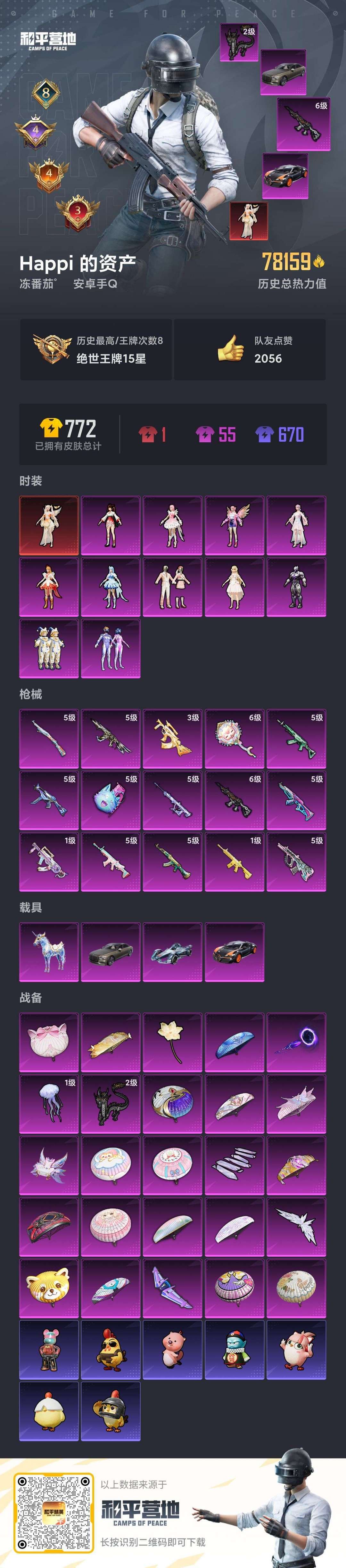 三级红装露米娜,15特效枪,火箭少女,小丑鱼,3车1水晶马,有众多热门飞行器降落伞,欢迎租号