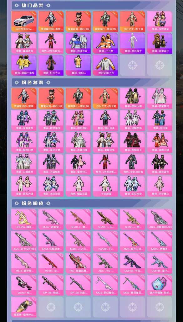 装备描述:[粉色枪械]: GROZA-精灵之光[3级],M762-甜蜜誓约[7级],SCAR-L-魔童闹海哪吒[1级],SCAR-L-天蓬元帅[8级],SCAR-L-金蛇镇世[1级],AUG-超新星[7级],AUG-许七安[1级],AKM-炫紫旋律[7级],M416-心之恋语[7级], Kar98K-巳巳如意[5级],AMR-炫光之旅[4级],M200-伏羲圣卦[4级],Mk14-盛世惊鸿[3级], Mini14-龙虾霸霸[5级],P90-能量风暴[7级],AKS-74U-信仰神谕[4级],UMP45-宇宙意志[3级], UMP45-量子极限[5级],Vector-绯穹魔姬[4级],DP-28-枪炮玫瑰[5级],DP-28-豹影疾电[5级], MG3-梦幻舞会[4级1.MG3-辉羽雀灵「3级1.破片手 毁号行为涉及毁坏虚拟财产罪及计算机安全罪,请文明游戏素质游戏,让我们共建美好租号平台!