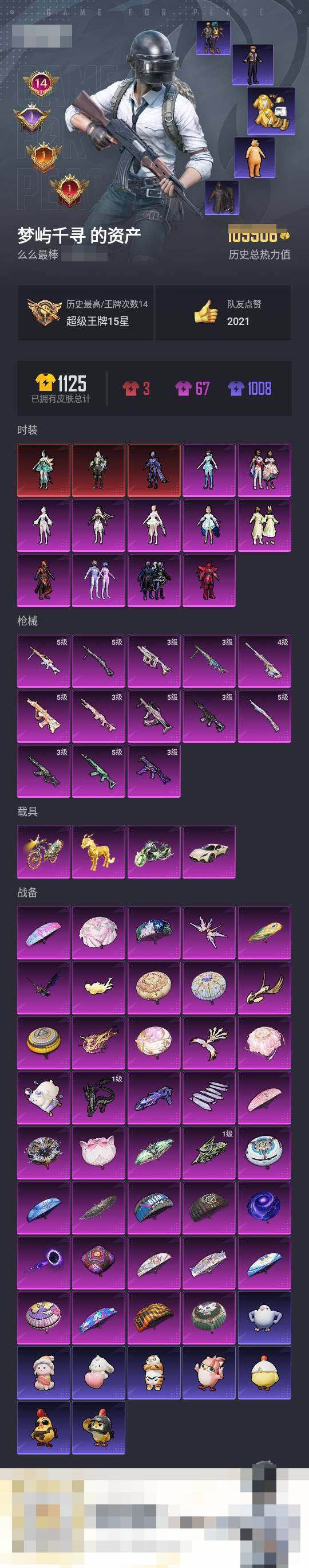 装备描述:速玩号!3神装-11粉装-13特效枪-4载具-12粉色飞行器-14王牌印记-229套装-284枪皮【红色神装等级】:辉羽雀灵-初翊(四级),幽焰骑士-维塔(一级),宇宙意志-塞卢姆(一级)【红色角色神装】:辉羽雀灵-初翊,幽焰骑士-维塔,宇宙意志-塞卢姆【热门品类】:粉装-梦幻火箭,套装-派对舞王,套装-深海小丑鱼,套装-奇异狩猎者,套装-龟仙人,套装-暗影哥特,角色-Mark.06,小恶魔头饰【粉色载具】:玛莎拉蒂MC20(星石白),幽焰风驰摩托车,护世瑞兽,辉羽雀灵自行车【粉色套装】:粉装-梦幻火箭,粉装-炙焰赤龙,粉装-暗夜玫瑰,角色-洛天依,粉装-炎氏战神,粉装-闲梦青缨,角色-千金淑猫,角色-信仰神谕,角色-女娲灵识,粉装-星穹咏叹调,角色-异瞳寒姬【粉色枪皮等级】:AKM-幽焰骑士(三级),M416-墨龙九天(三级),GROZA-镜光银凌(五级),AUG-暖羊咩咩(五级),M762-青锋波束(五级),UMP45-宇宙意志(三级),Vector-最终圣卫者(三级),Kar98K-巳巳如意(五级),Mk14-盛世惊鸿(三级),AMR-智耀战神(四级)