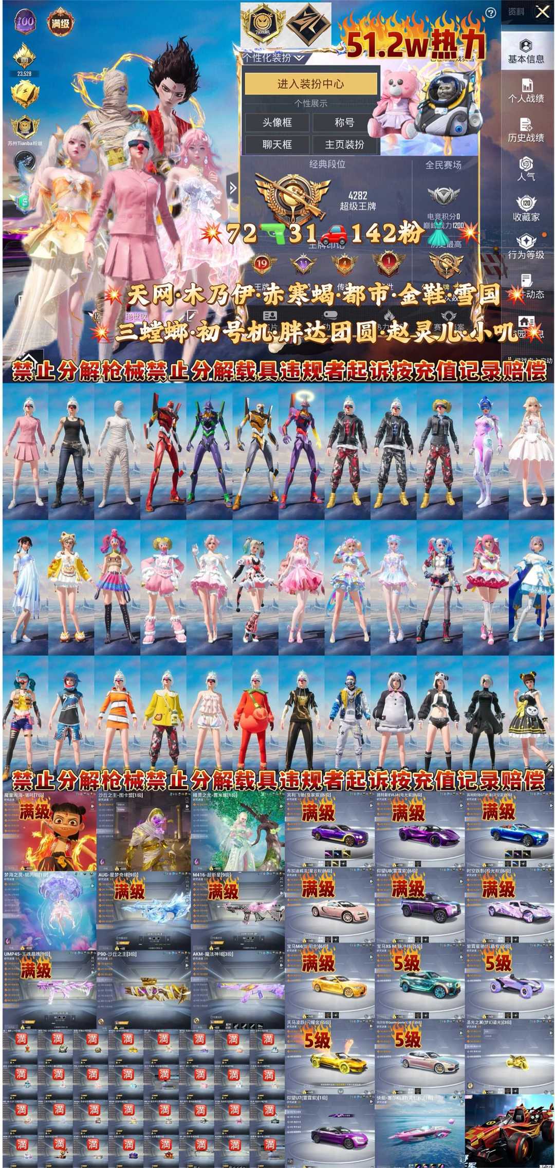 限制: 租号2次及以上 | 撤单率<25%才可租用此帐号装备描述:绝世印记神豪52万热力公主最新满级艾丽娅 满级哪吒满级图卡盟老101满级素材52万热力40把满级枪13台满级车 150粉80枪40载具全部稀有素材天花板 最新神装满级哪吒满级图卡盟满级精灵之光满级妮芮妲老101满级素材 52万热力40把满级枪全覆盖11台满级车 魂环螳螂 三螳螂 木乃伊 都市 赤蝎 寒蝎 金鞋 天网 雪国 放客 猪妹 巧克力 赵灵儿 小番茄 团团 新老101 哈莉小丑 猪妹 洛天依 小丑鱼 2b2p 满级星梦奇缘满级超新星 满级玉魂惊破 满级黄金宝马 满级星河领航 满级仰望u8 满级宾利gt 满级布加迪 满级路特斯 满级宾利飞驰5级宝马x65级玛莎拉蒂5级天马悦凌5级蹦蹦车3级摩托车