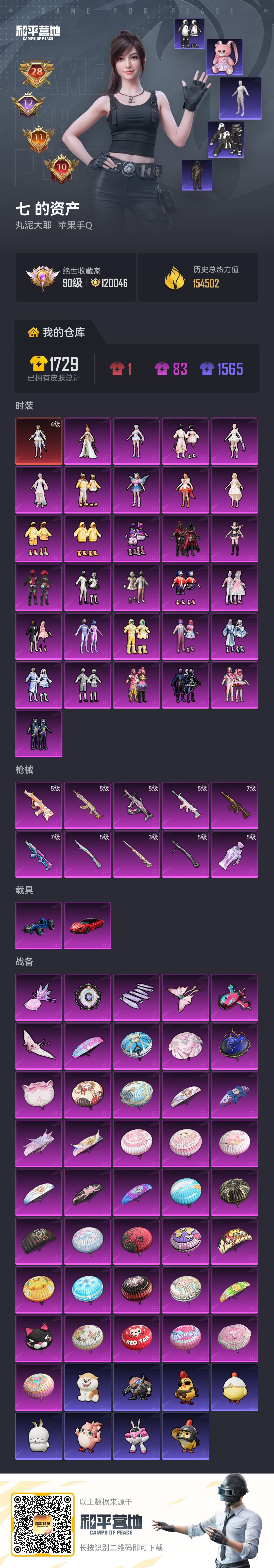 装备描述:1红30粉10枪2载具 高印记-战神框 4级欧若拉 木乃伊暗夜之虎 胖达圆圆 发光眼罩 深海小丑鱼 新101 胖达团团 猪妹 萌熊背包 3级境域双华M24 7级梦之光华AK 7级五爪金龙M4