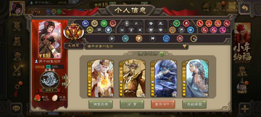 装备描述:一等大将军 VIP:15 武将总数:454 史诗武将:88 动态皮肤:59 魏国武将:⚡郝昭⚡谋曹贼⚡王粲⚡王凌⚡文鸯⚡界于禁⚡界钟会⚡界曹真⚡嵇康⚡程昱⚡戏志才⚡杨修⚡陈琳⚡曹婴⚡刘晔⚡王元姬⚡羊徽瑜⚡SP司马昭⚡曹纯⚡马钧⚡司马师⚡星周不疑⚡ 蜀国武将:⚡王平⚡诸葛瞻⚡谋马超⚡谋赵云⚡谋夏侯氏⚡谋黄忠⚡花鬘⚡界黄忠⚡马云騄⚡张星彩⚡董允⚡赵襄⚡关索⚡沙摩柯⚡鲍三娘⚡周群⚡ 吴国武将:⚡骆统⚡周处⚡吴景⚡界徐盛⚡班吉拉斯⚡界朱然⚡贺齐⚡孙皓⚡留赞⚡孙寒华⚡ 群雄武将:⚡左慈⚡许攸⚡杜预⚡刘璋⚡张仲景⚡皇甫嵩⚡界左慈⚡沮授⚡界李儒⚡张让⚡麴义⚡陶谦⚡士燮⚡司马徽⚡卑弥呼⚡刘焉⚡王允⚡苏飞⚡徐荣⚡张琪瑛⚡公孙康⚡兀突骨⚡杨彪⚡祢衡⚡庞德公⚡郑玄⚡南华老仙⚡星甘宁⚡星黄忠⚡ 神将:⚡神吕蒙⚡神周瑜⚡神诸葛亮⚡神曹贼⚡神吕布⚡神赵云⚡神陆逊⚡神刘备⚡神甘宁⚡神张辽⚡神郭嘉⚡神太史慈⚡神孙策⚡神荀彧⚡ 排位武将:145 国战武将:103 玄天通冥-神曹贼 战龙在野-神赵云 绽焰摧枯-神陆逊 万人辟易-神甘宁 举棋若定-戏志才 锋芒毕露-曹婴 鼠年冬至-王元姬 破军杀将-徐盛 灵魂歌王-留赞 鸠