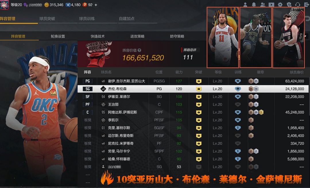 限制: 租号1次及以上 |装备描述:China龙之队李凯尔+王治郅+满亚力山大/莱德尔/X1金老萨/布里奇斯+布伦森+马卡。全部球员满突。满突王朝阵容:雷霆iso单打得分王,亚历山大总评125(数据历史新高,中投129,3分100,突破120+),满突满训叩将莱德尔总评108(历史拉文,顶阶街头娱乐球星,中投112,三分103,突破叩篮126,有公园篮包,街头各种爆叩);满突X1金老萨总评115,背身、防守、投射徽章齐全,进攻万花桶; 基特尔斯,射手,中投123,三分109;史蒂夫史密斯(中投116,三分105),迈尔斯布里奇斯(黄蜂叩将),大白怀特塞德(双板118,双卡位徽章,盖帽118);基特尔斯,米罗蒂奇,小卡。三模式畅玩。强退和恶意消及等会收押金!谢谢了。