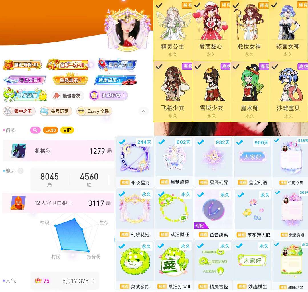 (小凯75级)500万人气⚡永夜一套⚡菜狗一套⚡幻纱一套⚡机械狼1200⚡白狼3000⚡
