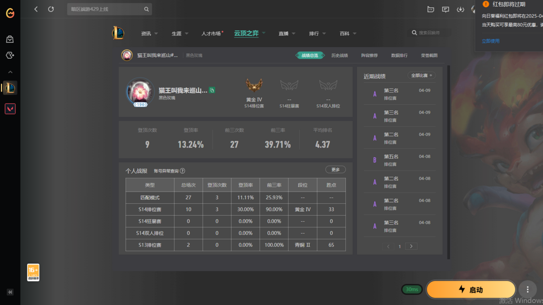 【电10黑色玫瑰】云顶之羿【S16翡翠号】适合开黑垫分使用【翡翠钻石铂金可排】