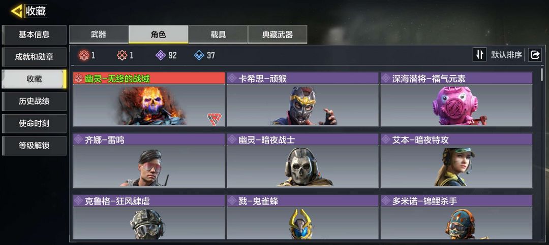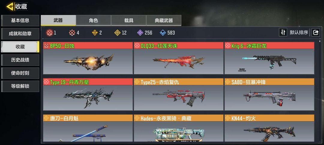 装备描述:武器收藏 - 神话级: - BP50-日蚀、DLQ33-红莲天诛、Krig 6-冰霜巨龙、Type 19-丹青万壑 - 传说级(橙标): - 典藏:Hades-永夜黑骑、50GS-路阻且长 - 联动:飞翼浮游炮-ν高达 - 其他:Type25-赤焰复仇、SA80-狂暴冲锋、唐刀-白月魁、KN44-灼火、电棍-永恒炽热、Krig 6-苍天之剑等 - 史诗级(紫标):256把, - 稀有级(蓝标):583把 角色收藏 - 神话级: - 幽灵-无终的战域 - 史诗级:92 - 稀有级:37
